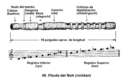 La flauta se conoce como nohkan, y es el único instrumento de viento (Fig. 49). Es una flauta traversa con siete orificios para los dedos y difiere de otras flautas traversas tradicionales, tales como ryûteki de Gagaku, o shinobue usada en música de festivales tradicionales. El intérprete la coloca contra su mentón y orientada hacia la derecha, y la apoya con los dos dedos pulgares y con cualquier otro dedo que no esté en uso. El sonido se produce al soplar por la embocadura (uta-guchi, lit. boca de canto) y cubriendo o descubriendo los orificios. La nohkan no es una simple pieza de bambú sino un tubo construido de entre ocho y doce tiras angostas de bambú, atadas con una enredadera fina tal como glicinia y está lacarada por dentro. Una característica única de la flauta nohkan es la garganta (nodo), un tapón de cera de abejas y plomo inserto dentro de la flauta entre la embocadura y la cabeza; generalmente hay un ornamento de oro muy elaborado inserto en la cera y visible como decoración en la cabeza de la flauta.