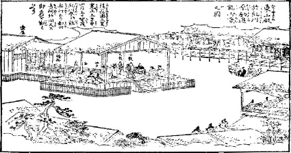 32. Noh de Abono. Grabado de una función de Noh para recoger fondos llevada a cabo en las riveras del río Kamo en 1465. (tomado del Man'yôshû Senshûraku). El escenario está abierto po los cuatro lados y el puente se une a este por la parte central trasera. Hay escenarios laterales (waki za) a la derecha e izquierda, el waki, el percusionista de tambor de hombro y el del tambor de costado al lado izquierdo del escenario, y el coro, el flautista y el intérprete del tambor de baquetas al lado derecho.
