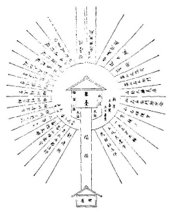 33. Noh de Abono. Planos del escenario y los lugares para el público en una función que incluía Okina en el tercer día del Año Nuevo. (tomado del Gunshoruijû). El puente une la parte trasera del escenario con el camerino. El waki, flautista y percusionistas de los tambores de hombro y de costado están en el escenario izquierdo, el otro percusionista y el coro, en el derecho.